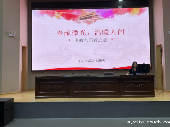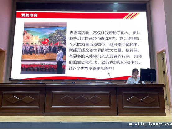 优秀青年志愿者杨庆同学以“我的志愿者之旅”为题,通过“社区帮扶空巢老人”“儿童壹基金”“比赛现场志愿者服务”等真实案例,展现志愿服务对提升个人能力和实现社会价值的双重意义,号召全体团员以实际行动践行“奉献、友爱、互助、进步”的志愿精神,积极投身志愿者的行列,用爱心和行动,践行党的初心和使命,让世界变得更加和谐美丽!