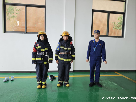 同学们观看了消防员穿戴战斗服的全过程,并尝试亲自穿上战斗服。这一过程不仅让学生们了解到消防员快速反应的必要性,也让他们体会到消防员辛苦。